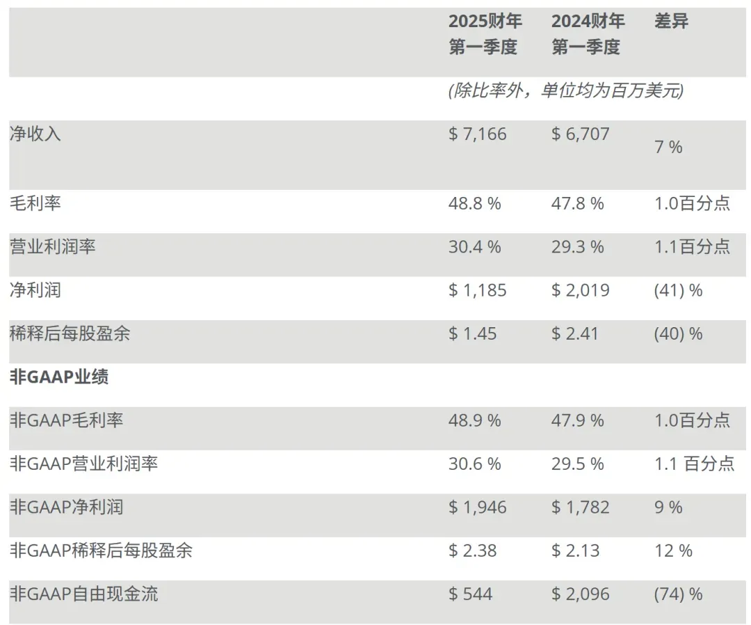 该公司官网显示,2025财年第一季度,公司营收71.7亿美元,同比增长7%,净利润11.85亿美元,实现经营活动现金流9.25亿美元,GAAP营业利润率30.4%,非GAAP营业利润率30.6%。