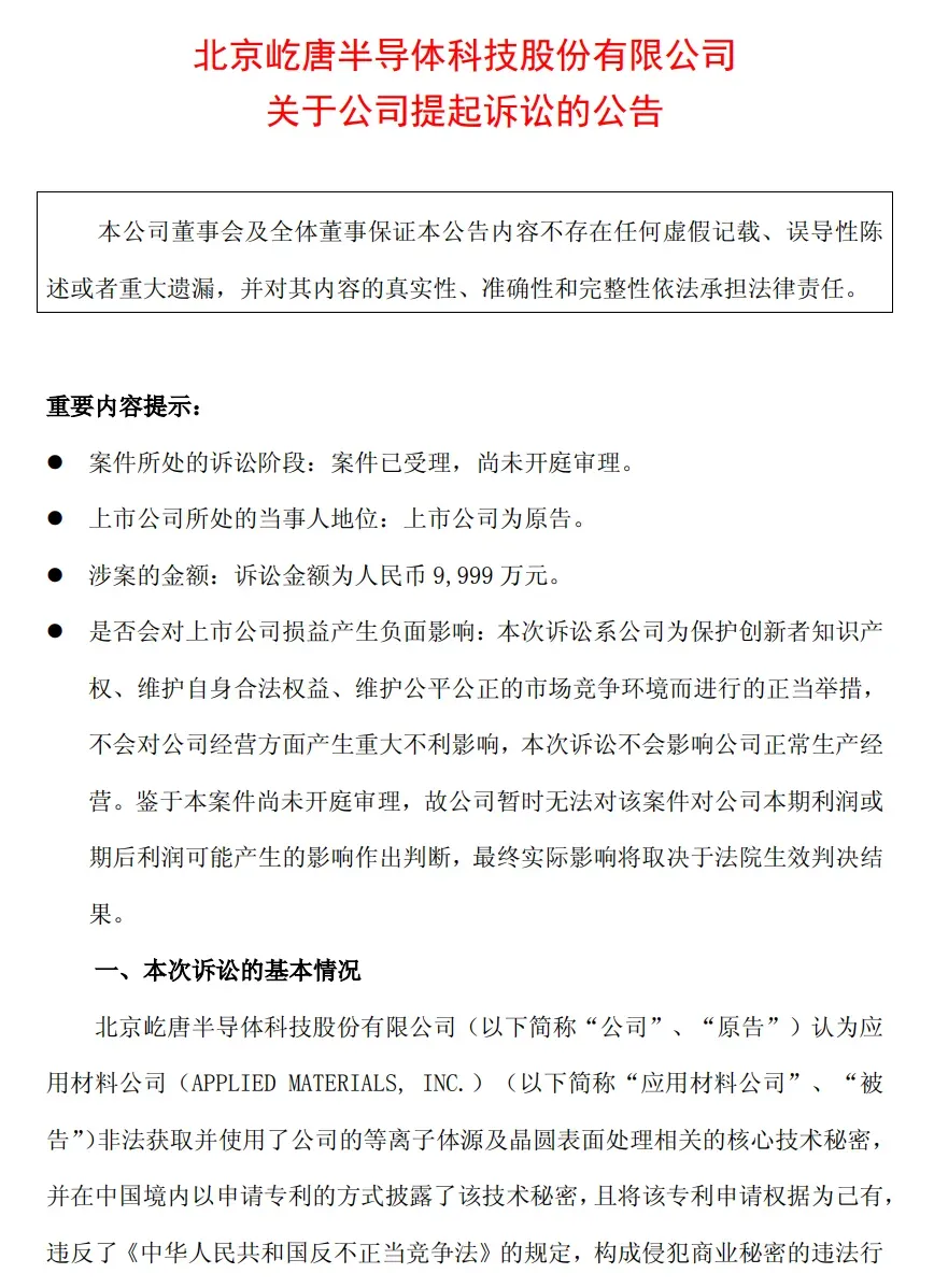 8月13日华融配资,国内半导体设备龙头北京屹唐半导体科技股份有限公司(以下简称“屹唐股份”)公告称,公司因认为应用材料公司(APPLIED MATERIALS, INC.)非法获取并使用了公司的等离子体源及晶圆表面处理相关的核心技术秘密,在中国境内以申请专利的方式披露了该技术秘密,且将该专利申请权据为己有,违反了《中华人民共和国反不正当竞争法》的规定,构成侵犯商业秘密的违法行为,向北京知识产权法院提起诉讼,诉讼金额为人民币9999万元。