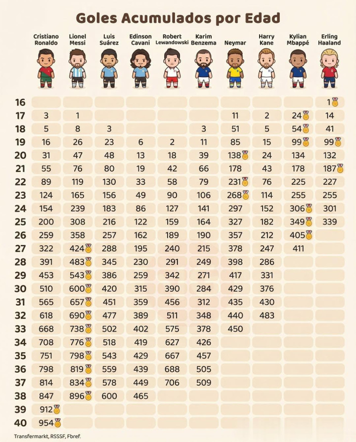 12月29日。有媒体采用了三大权威机构Transfermarkt(德转)、RSSSF和Fbref的数据,统计了包括梅西、C罗、内马尔、苏亚雷斯、莱万、本泽马、凯恩、姆巴佩、哈兰德和卡瓦尼这些超巨、巨星的进球数,并且按照年龄来给出每一岁的历史进球王。